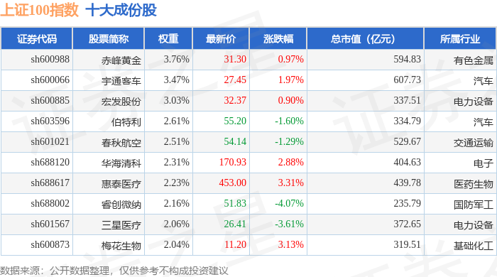 上证100(000132)指数十大成份股详情如下: