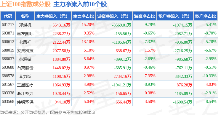 资金流向方面,上证100(000132)指数成份股当日主力资金净流出合计11.91亿元,游资资金净流入合计5.27亿元,散户资金净流入合计6.63亿元。成份股资金流向详情见下表: