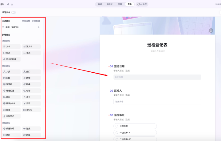 如果你以为做一个数据驾驶舱就是钉钉AI表格核心功能,那你就大错特错了。钉钉AI表格提供自定义表单功能,用户可以根据自己的需求进行任意表格编辑,里面搭配各种常见、常用的表格菜单,只需要简单的拖拉拽,就可以实现一个自动化表单的生成,完全不需要你有任何的代码能力就可以直接收集信息。