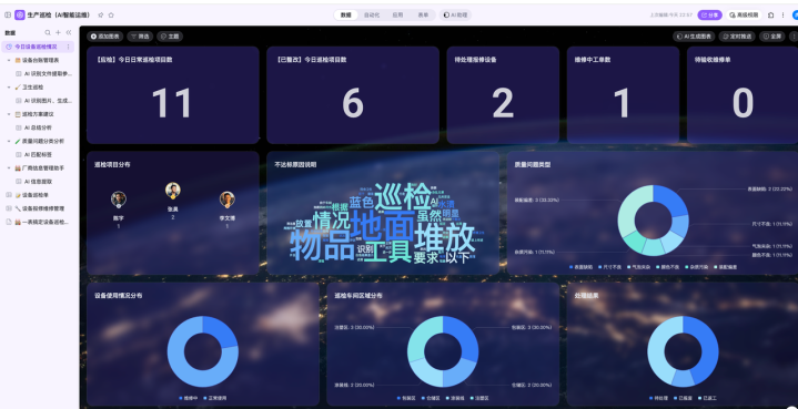 使用钉钉AI表格后,情况得到了极大的改善。员工只需将相关的统计数据导入钉钉AI表格中,然后通过自然语言向AI表格助理下达指令,例如:“计算每个月不同设备的设备使用情况、损坏情况和维修次数,并生成图表进行对比分析”。AI表格助理接收到指令后,能够迅速理解需求,自动识别和处理表格中的数据。它会在瞬间完成复杂的计算工作,不仅准确地计算出每个月不同设备的定义数值,还会根据这些数据自动生成直观清晰的图表,如柱状图、折线图等,以便员工更直观地进行数据分析。